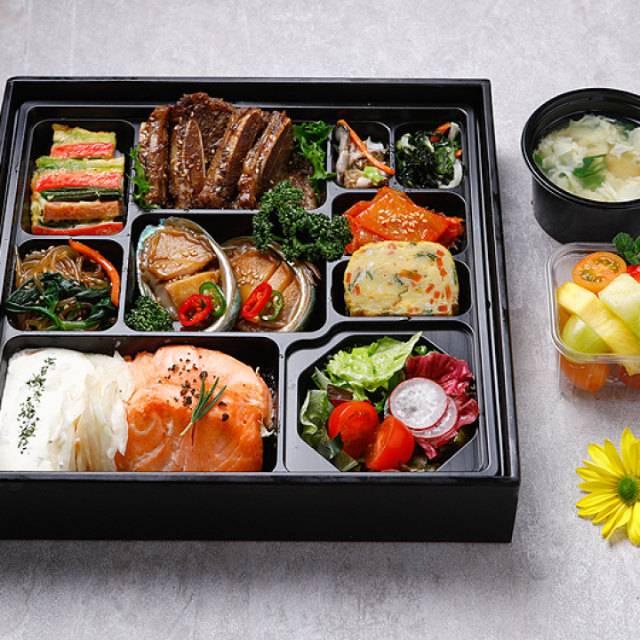 | 전복장+LA갈비+연어스테이크+샐러드+ 6종 반찬+밥+국(따로제공 / 물로 대체가능)+후식 |