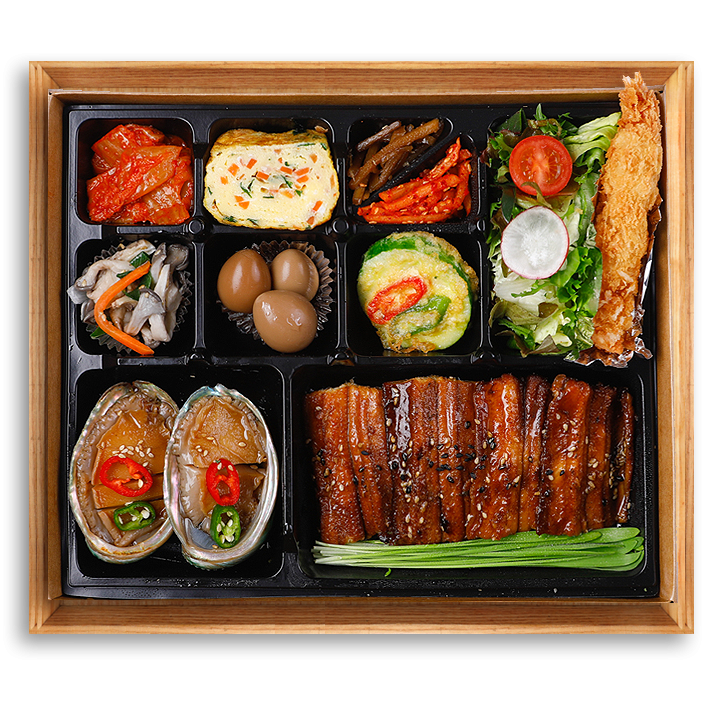 샐러드+전복장+장어구이+후식+왕새우튀김+6가지 반찬+밥+국